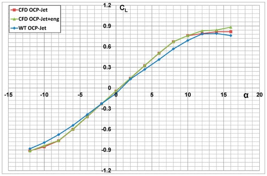 Aerodynamic lift characteristics of an aerial target with engine thrust effect (CFD OCP-Jet-eng) and without (CFD OCP-Jet).