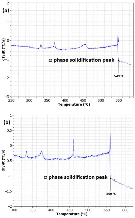 Cooling curve analyses for (a) 0.4 wt% Fe Al–Zn–Mg–Si alloy and (b) 0.1 wt% Fe Al–Zn–Mg–Si alloy.