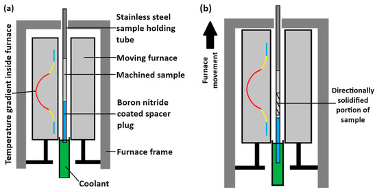 DS apparatus used for solidifying AM samples against a temperature gradient. (a) Shows a labelled schematic of the sample and furnace prior to a DS experiment, and (b) shows the positioning after. The cross-hatched portion of the sample in (b) has been re-melted and solidified inside the furnace against the temperature gradient and is the portion of interest.