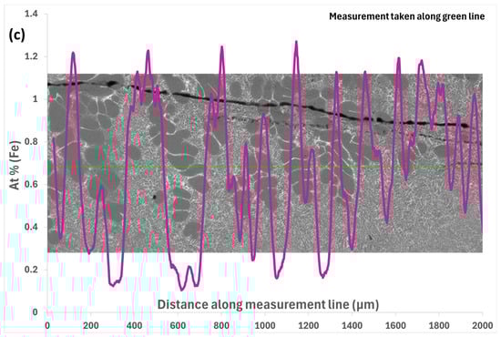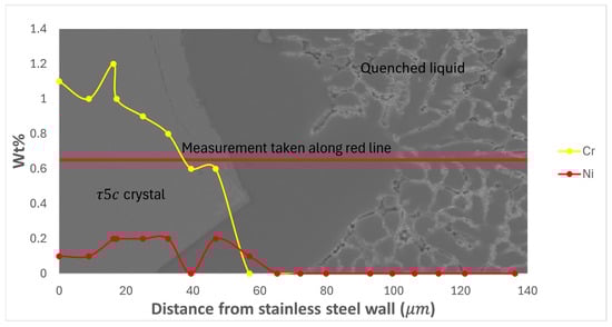 EDS measurement of two types of area in the ‘high’ part of the directionally solidified sample containing 0.4 wt% Fe was undertaken, with the two measurement areas consisting of a location where the modified τ5c IMC has formed and the second consisting of a point where there has been direct contact between the stainless-steel tube and the liquid alloy but with no visible reaction, as illustrated in Figure 3. The composition of the alloy with distance from the stainless-steel tube was mapped and is presented in Figure 4, Figure 5 and Figure 6. The deposition of Cr and Ni from the stainless steel was exclusively limited to the modified τ5c phase (verified with SEM-EDS), with no further dissolution into the quenched liquid, as seen in Figure 4. Figure 4 shows that outside the crystal of the modified τ5c phase, the Cr and Ni content drops to undetectable levels. It is believed that this is due to Cr and Ni’s low solubility in the Al liquid. The composition of the liquid was found to stabilise quickly with increasing distance from the stainless-steel tube wall, with Fe content decreasing sharply following the transition from the modified τ5c crystal to α-Al and the quenched liquid, as seen in Figure 5. In areas where there is no visible reaction between the stainless-steel tube and the alloy, the Fe content is seen to be elevated near the edge of the stainless-steel tube but quickly drops to equilibrium within 60 μm. Likewise, even in samples where the modified τ5c phase has formed, the composition stabilises within approximately 20 μm, as seen in Figure 6.
