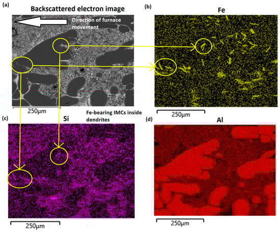 SEM EDS capture showing the composition of a directionally solidified Al–Zn–Mg–Si sample. (a) Backscattered electron image (b) Fe content (c) Si content (d) Al content.