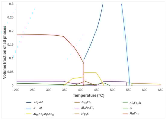 Thermo Calc one-axis equivalent phase diagram for 0.4 wt% Fe-containing Al–Zn–Mg–Si alloy [9].