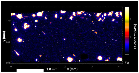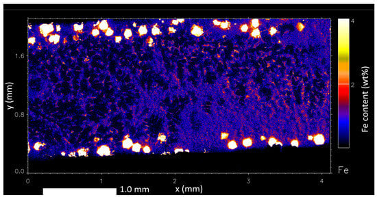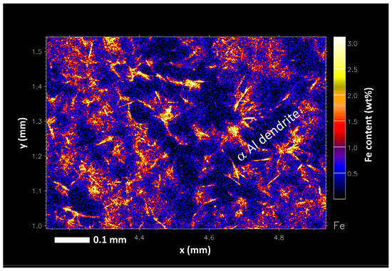 Full image of Fe distribution in the fully solidified (low temperature) region in a nominal 0.4 wt% Fe-containing Al–Zn–Mg–Si alloy.