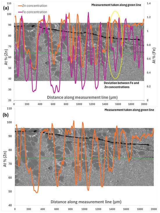 In Figure 14, the trend of both Fe and Zn content falling across phase dendrites can be observed, with a sharp rise across areas of quenched liquid. The concentration is lowest at the middle of the dendrite due to interface layer effects and the active rejection of solutes during solidification. Although the concentrations of Zn and Fe differ greatly in magnitude, the peaks and valleys of the line scan in Figure 14 still show that they share the same trends across -phase dendrites and the quenched liquid. There is an exception circled in Figure 14; however, analysis of the backscattered SEM image indicates that the discrepancy is most likely caused by a small Fe-bearing IMC particle in the liquid. An interesting observation is that from the LHS (cooler end) to the RHS (hotter end) of the graph, the average concentration of both Fe and Zn can be observed to increase across the positive temperature gradient. This is contrary to the Al–Fe and Al–Zn phase diagrams, which predict the solubility of Fe and Zn in Al to decrease with temperature [4]. It is possible then that the concentration gradient observed is a result of constitutional undercooling, which is known to create favourable conditions for the nucleation of new phases, especially Fe-bearing IMCs. The exception to this trend, observed in Figure 14, is at the transition from the final -phase dendrite to the liquid: although the Zn concentration continues to increase according to the measured trend, the Fe concentration decreases sharply in the quenched liquid beyond the solidified dendrite network. This may be explained either by an error in measurement due to the relatively low concentration of Fe in the alloy, or by reviewing the Al-rich corner of the Al–Fe binary phase diagram [4], which shows the solubility of Fe decreasing with increasing temperature below 1.7 wt% Fe, due to the existence of a eutectic point. Hence, it can be speculated that during the cooling of the alloy, initially, the Fe concentration in the liquid decreases, but following this eutectic point, it will increase again to concentrations that may permit the homogenous nucleation of fine Fe-bearing IMC phases.
