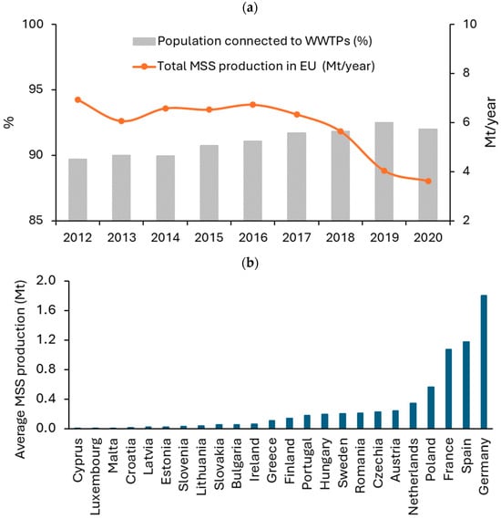 The MSS production in the EU countries: (a) total MSS production with percentage of population connected to WWTPs, (b) MSS production in EU countries (average from 2012 to 2020) [10].