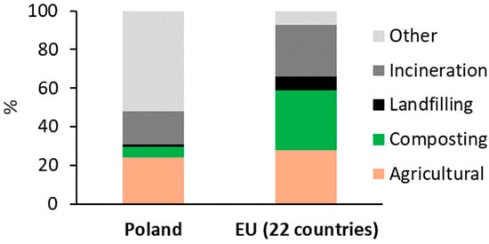 The management of MSS involves challenges due to its large volume, high moisture content, complex composition, and the presence of contaminants. However, despite these issues, MSS displays promise as a valuable resource owing to its substantial content of organic matter and nutrients [11]. Various MSS treatment technologies have evolved over the years, differing across regions of the world. Currently, MSS in Europe is dealt with mainly by agricultural application, development of plants for compost production (composting), thermal conversion (mainly incineration), landfilling, and other methods, such as storage of MSS in WWTPs, stabilization, anaerobic digestion, etc. It is worth mentioning that in some EU countries, such as Belgium, the use of MSS for agricultural purposes is restricted by legal measures. This restriction is due to the existing nitrogen surplus in soils and waters. A comparison of the methods for MSS management in Poland and in the EU countries is shown in Figure 2 [12], while the frequency of application of MSS treatment methods in different countries is compared in Table 1.