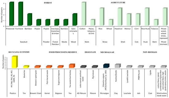 In addition to biomass co-substrates, other types of non-biomass co-substrates, such as clay, leachates, fly ash, lignite, and mixed fibers, have also been used in MSS co-pyrolysis. The use of these feedstocks provides a more comprehensive and diverse approach to co-pyrolysis, allowing for greater flexibility, adaptability, and optimization of the process and biochar properties.