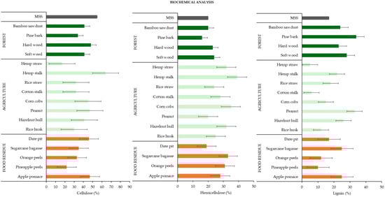 The results of biochemical analysis of MSS and co-substrates based on different studies (as median values with error bars of standard deviation) [121,156,157,158,159,160,161,162,163,164,165,166,167,168,169].