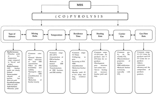 The conditions of a pyrolysis or co-pyrolysis process play essential roles in determining the yield, quality, and properties of the resulting product. These specific conditions include the type of furnace as well as operational conditions, such as mixing ratio (only for co-pyrolysis), temperature, residence time, heating rate, carrier gas, and gas flow rate (for pyrolysis and co-pyrolysis), which are instrumental in ensuring the desired outcome. As such, the optimization of these conditions requires careful consideration and attention. Figure 9 summarizes the main effects of pyrolysis conditions on MSS biochar, while Table 4 provides a comprehensive analysis of the effects of operational conditions of pyrolysis and co-pyrolysis on MSS biochar yield, depending on the furnace type.