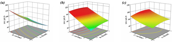 The 3D response surface plots described by the regression model show the effect of independent variables and the interaction of independent variables on the CST. The dosage of OEMR3 in Figure 1a, OEMR1 in Figure 1b, and OEMR2 in Figure 1c was set as 3%, respectively. The graphs in Figure 1a,b are inclined slopes, indicating that the interaction between the two factors is not significant [35]. Conclusions are drawn based on the results of the response surface calculation that the three influencing factors have a positive impact on the CST value of sludge in the order of C > A > B.