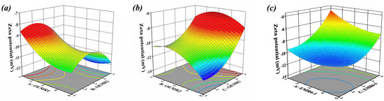 As mentioned above, the 3D response surface plots described by the regression model present the effect of independent variables and the interaction of each independent variable on the zeta potential. The dosages of OEMR3 in Figure 3a, OEMR1 in Figure 3b, and OEMR2 in Figure 3c were also set at 3%, respectively.