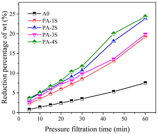 The sludges conditioned with PA-1, PA-2, PA-3, and PA-4 are named as PA-1S, PA-2S, PA-3S, and PA-4S, respectively. The dehydration rate of A0 was less than 10%, while that of PA-1S and PA-3S could reach 20% under the same conditions, and that of PA-2S and PA-4S touched 25% (Figure 5). Among them, PA-4S showed the best performance in the dewatering process. The dehydration rate of PA-1S, PA-2S, PA-3S, and PA-4S held the similar trend in the first 30 min, but that of PA-3S and PA-4S increased significantly after 30 min and continued the dehydration advantage until 60 min. Throughout the dehydration process, PA-4S performed slightly better than PA-3S in the dehydration rate. It can be concluded that PA-4S has the best dewatering effect by filter press according to the moisture content reduction curve.