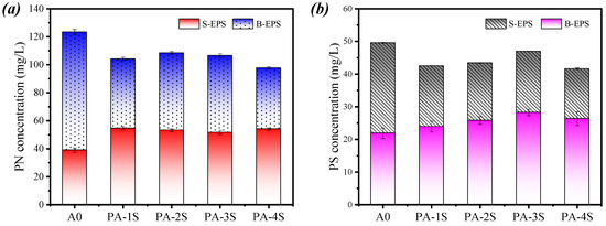 The proteins (PN) and polysaccharides (PS) are the principal component of the EPS matrix in the activated sludge, containing a large quantity of functional groups. Figure 6 shows the changes of PN and PS contents in S–EPS (Soluble-Extracellular Polymeric Substances) and B–EPS (Bound-Extracellular Polymeric Substances), respectively. The PN of S-EPS increased in all four groups of filtrates obtained from the conditioned sludge, and that of B-EPS decreased (Figure 6a), which indicates that the use of PA-1, PA-2, PA-3, and PA-4 can effectively cleave B-EPS to S-EPS, thus, releasing the bound water wrapped around B-EPS and therefore increasing the content of S-EPS. Compared with that in A0, the PN of S-EPS in PA-1S, PA-2S, PA-3S, and PA-4S was increased by 36.50%, 33.20%, 29.10%, and 35.33%, respectively, indicating that the conversion rate of S-EPS in PA-1S reached the peak. The PN in B-EPS decreased by 16.25%, 12.75%, 14.31%, and 21.40%, respectively. Wilen [36] found that high abundance of protein may deteriorate the dewatering performance of the sludge because of its hydrophilicity and negative charges. Contrary to those of PN, the concentration changes of PS in S-EPS and B-EPS showed a different trend. The PS content of S-EPS in A0 was the highest, and that of S-EPS in PA-1S, PA-2S, PA-3S, and PA-4S increased by 9.32%, 17.91%, 29.05%, and 20.33%, respectively, while the PS in B-EPS decreased by 14.21%, 12.40%, 5.24%, and 16.01%, respectively. In general, the change of PN is more significant than that of PS. These findings indicate that the use of PA series conditioners can effectively decompose PN in B-EPS, but weakly decompose PS in B-EPS.