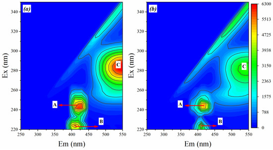 The organic compounds in the EPS of sludge samples were characterized by 3D-EEM fluorescence spectra, as shown in Figure 6. The X-axis represents the emission spectrum from 250 to 550 nm, while the Y-axis represents the excitation wavelength from 220 to 350 nm. Peak A was located in the region of the excitation/emission wavelengths (Ex/Em) between 255–265/315–330 nm, and Peak B was situated between 220–230/325–335 nm in Figure 7a. Peak A and Peak B were assigned to tryptophan-like substances and tyrosine-like substances, respectively [37], which illustrated that the tryptophan-like (Peak A) and tyrosine-like substances (Peak B) were two major substances in B-EPS in both A0 and PA-4S. Peak C located in the region of Ex/Em between 275–285/500–550 nm was presumed to be aromatic protein [8]. The fluorescence intensity of peak C in Figure 7b nearly doubles that of peak C in Figure 7a, indicating that the concentration of aromatic protein in Figure 7b is much smaller than that in Figure 7a. These findings strongly support the results presented in Figure 6. In addition, Peak A, Peak B and Peak C also appeared in the same region in Figure 7b, but the fluorescence intensity was much weaker than that in Figure 7a, which should be attributed to the reduction of protein content. These results reconfirm the conclusion in Figure 6.