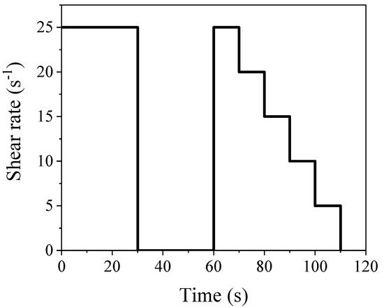 The flowability and its retention ability were studied by a flow table test and rheological measurement. The flow table tests for the samples after curing for 5 min, 1 h, and 2 h were conducted according to [31]. The rheological measurement was performed by using a rheometer with the Couette geometry (TR-MRI, Tongrui Instrument Company, Shanghai, China). The specific procedure for the measurement is shown in Figure 2. The Herschel–Buckley model (H-B model, Equation (1)) was used to obtain the rheological parameters, where , , k, , and n are the shear stress, yield stress, consistency indices, shear rate, and rheological indices, respectively [32,33].
