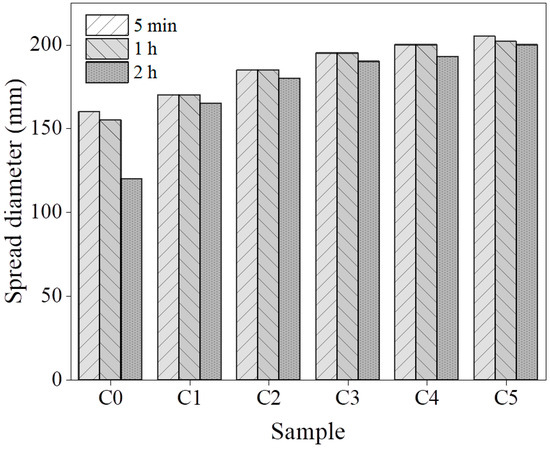 Figure 3 presents the influence of different CCG substitution ratios on the flowability of the pastes after the preparation of 5 min, 1 h, and 2 h. With the increase in CCG’s substitution ratio, the flowability of the paste at 5 min increased from the initial 160 mm to 205 mm (28.1%) step by step, which indicates that the co-blending of CCG with MK is beneficial to increase flowability. Regarding the ability of fluidity retention, an obvious decrease in the spread diameter of C0 can be observed after curing for 2 h, which could be caused by the reaction of MK under the activation of alkali. However, it is interesting to notice that along with the increased substitution ratio of CCG, an obvious reduction in the loss of diameter was found, which indicates that the use of CCG is beneficial to increase the retention ability of AAMs due to their low pozzolanic activity compared to MK [34].