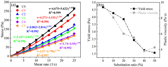 (a) Shear rate–shear stress curves of pastes prepared for 5 min; (b) the calculated yield stress and viscosity.