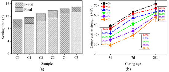 The setting time of AAM paste with different substitution ratios of CCG is shown in Figure 5a. Clearly, the increased CCG substitution ratio prolonged the setting time of the AAM pastes, which could be caused by the low activity of CCG compared to that of MK.