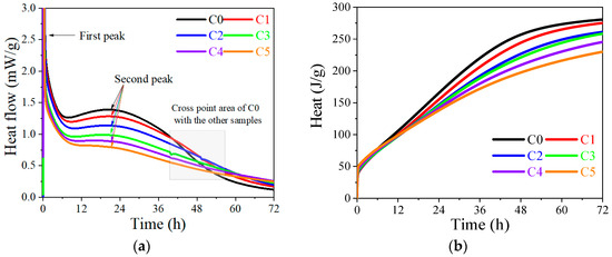 The heat flow and the cumulative heat for AAMs with different substitution ratios of CCG are shown in Figure 6. Clearly, an obvious exothermic peak can be found in Figure 6a within 1 h, which originates from the wetting and dissolution of the silica–aluminate precursors [37]. The appearance of the second exothermic peak is generally thought to be related to the reaction of precursors under the activation of alkali and the formation of reaction products [38,39].
