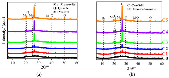 The compressive strength of samples with different substitution ratios of CCG was tested after curing for 3, 7, and 28 d, and the results are shown in Figure 5b. It shows that along with the increase in the substitution ratio, the compressive strength of hardened AAM paste decreases gradually, especially at 3 and 7 days. Compared to that without CCG (reference, named C0), the strength loss at 3 d and 7 d can reach 44.0% and 38.1%, respectively, for the sample with 50% CCG to replace MK (named C5). Generally, the mechanical properties of AAMs are highly related to the reactivity of the precursor. Despite a higher activity of CCG compared to that of CG after calcination, a large number of inert phases that do not participate in the reaction, such as quartz, are still present, which reduces the compressive strength of the hardened paste [1,36]. However, after curing for 28 d, the strength loss was significantly reduced compared to C0, which is only 19.2%. This indicates that the presence of CCG could not be beneficial for the mechanical property of hardened AAMs at an early age, which is believed to be caused by the low activity of CCG. However, from a long-term aspect, the strength of C5 can be gradually increased, and the compressive strength at 28 d can be nearly 60 MPa, which is enough for a lot of engineering applications.