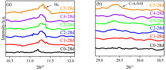 To further understand the effect of CCG on the performance of alkali-activated MK, the XRD patterns of the reaction products in samples after curing for 3 d and 28 d are shown in Figure 8. A broad peak was observed in the 2θ from 20° to 40°, which can be attributed to the amorphous aluminosilicate gels formed after the reaction [40]. Hence, a higher intensity for this broad hump can be found with increased curing age. Additionally, if we compare the effect caused by the addition of CCG, from one aspect, the intensity of the broad hump decreased significantly. In addition, more sharp peaks can be found with the incorporation of CCG. As shown in Figure 1, quartz, muscovite, and mullite are contained in the CCG. Hence, it is not strange to see an increased peak intensity for these minerals inside the hydrated samples. However, some new peaks can be found for the samples with the increased CCG content, namely a peak at around 29.3° and 11.2°, which corresponds to C-A-S-H and hemicarbonate (Hc), respectively [41]. An amplification for these two peaks was made, and it is shown in Figure 9. Clearly, the peak generated from Hc can be found when the CCG content is 10%, but the obvious C-A-S-H peak was only observed when the substitution ratio of CCG is 50%.