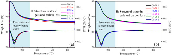 The TGA-DTG curves of different samples at 3 and 28 d are shown in Figure 10. The thermal mass loss of the samples can be explained by two main stages [42,43]. In the first stage (about 25 to 300 °C), the mass loss can be attributed to the evaporation of free water and loosely bound water, which is relatively easily evaporated from gel pores. The second stage of mass loss (from 300 to 890 °C) is caused by all the structural water in the form of -OH in the gels and the carbon in the carbonate. The results of mass loss for each temperature range are shown in Table 4. Firstly, an increased total mass loss of all samples was observed with the increased curing age due to the progressed polymerization. Since there is little difference in the carbonates, the mass loss in the second phase can be mainly related to the structural water in the gel phases [44].
