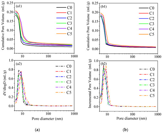 The pore distribution of alkali-activated MK co-blended CCG at the ages of (a) 3 d; (b) 28 d, wherein 1 refers to the cumulative pore volume and 2 refers to the incremental pore volume.