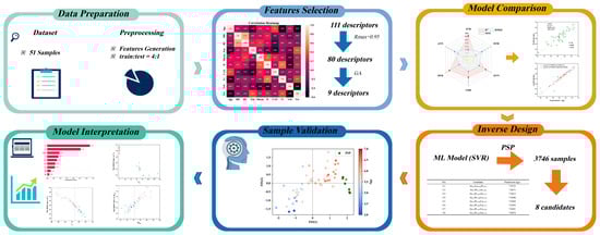 In this work, we introduced an inverse design framework that integrated an interpretable ML model and proactive searching progress (PSP) to design low-resistivity TGAs. First, 51 samples were collected from the literature to construct the dataset. Subsequently, feature engineering was conducted, including descriptor imputation, data preprocessing, and feature selection. After comparing a series of models, the support vector regression (SVR) model was selected for modeling and SHapley Additive exPlanations (SHAP) was used for model interpretation [22,23]. The self-developed PSP method was then employed to design new TGAs with low resistivity, and the candidates were validated using a pattern recognition method. This inverse design framework will provide significant guidance for discovering low-resistivity TGAs and can be applied to the design of other materials.