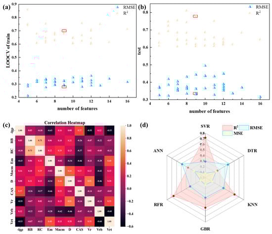 Feature selection and model comparation. (a) The R2 and RMSE of each feature subset in the training set. (b) The R2 and RMSE of each feature subset in the test set. (c) Correlation of 9 features. (d) The RMSE and R2 values for each algorithm on the training set using LOOCV. Note that the red frames represent selected features.