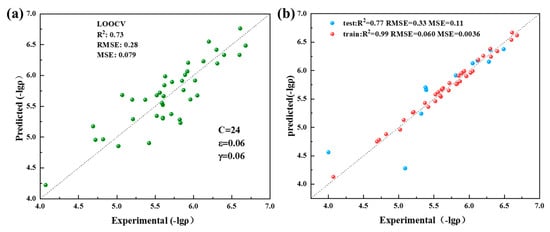 Once the model was selected, fine-tuning its parameters became pivotal for enhancing modeling performance. In the case of the SVR model, this study employed a grid search method for parameter optimization. With these optimized parameters, the R2 value reached 0.73 during LOOCV (Figure 4a), confirming the validity of our parameter choices.