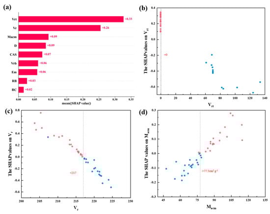 Explaining models using SHAP. (a) Feature importance ranking, (b) SHAP values of Vrt, (c) SHAP values of Vr, and (d) SHAP values of Macm. Note that red is positive and blue is negative.