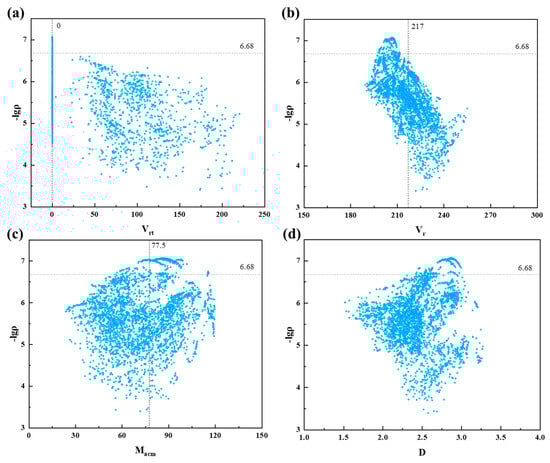 Visualization of descriptors: (a) Vrt, (b) Vr, (c) Macm, and (d) D. Note that the horizontal dashed line represents the minimum resistivity value in the dataset (−lgρ = 6.68).