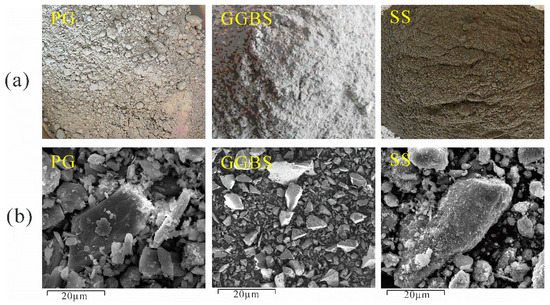 The materials utilized in the experiments outlined in this paper encompass phosphogypsum (PG), steel slag (SS), and ground granulated blast-furnace slag (GGBS), respectively. The alkali-activated agent employed was solid sodium hydroxide (NaOH), procured from Inner Mongolia Yihua Chemical Co. Figure 2 shows the raw material and the SEM image of the raw material. PG was provided by a company in Guiyang, Guizhou, China. The PG subjected to experimentation was meticulously sieved, with a mesh size of 5 mm in diameter. Characterized by its gray-white powder form, the initial PG exhibited a moisture content of 17.6% and a density of 0.86. Upon scrutiny via scanning electron microscopy (SEM), the PG revealed a flake-like morphology with discernible prismatic angles. SS was produced in Gongyi City, Henan Province, with the appearance of black particles, moisture content of 1.12%, and density of 1.64. It was observed under SEM that the shape of SS particles was irregular, mainly lumpy and granular. GGBS was produced from a processing plant in Hebei Province, white powder, with a moisture content of 0.8% and a density of 1.04 Under SEM, it was observed that the shape of GGBS particles showed irregularity and angularity.
