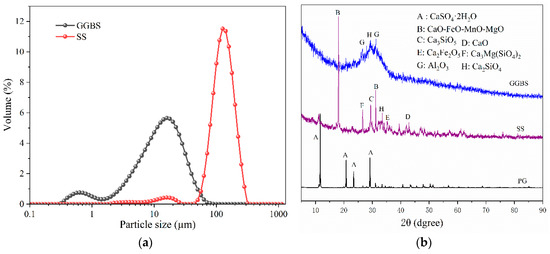 Particle size distribution and XRD analysis of raw materials: (a) Raw material particle size distribution; (b) XRD analysis of raw materials.