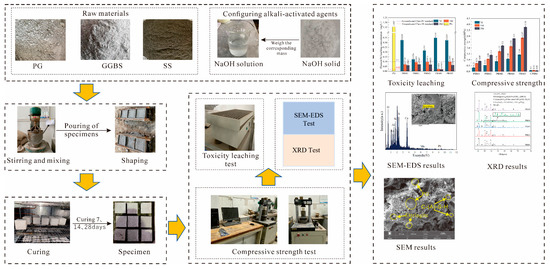 Backfill body specimen preparation process in accordance with JGJ/T 70-2009 [40] standard implementation, according to the table of the experimental program material ratio. First of all, weighed NaOH dissolved in distilled water to configure the Alkali-activated agent, then weighed the raw material, poured the material into the mixer dry stirring for 30 s, added the corresponding amount of water, and stirred for 60 s. Secondly, after mixing was completed, the slurry was poured into a feeler with a size of 70.7 × 70.7 × 70.7 mm for molding, and then the molded test specimen was put into a standard maintenance box for maintenance under standard maintenance conditions (temperature of 20 ± 3 °C, humidity of 90%) for 24 h and then demolded to obtain the test specimen, and then continue to place it in the curing box for curing. According to the Chinese standard JGJ/T 70-2009, unconfined compressive strength tests, toxicity leaching tests, and microstructure tests are conducted after curing for 7, 14, and 28 days. The specific process is shown in Figure 4.