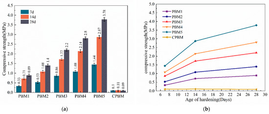 The PBM unconfined compressive strength test was conducted using a TYE-300D type cementitious sand compressive testing machine. Compressive strength tests were performed on PBM specimens with curing times of 7, 14, and 28 days. The loading rate of the instrument was fixed at 0.1 mm/min during the test, and the test was repeated three times for each group of tests, and the strength values used in the study were the average values calculated from the measured data. The unconfined compressive strength was used for microstructural analysis at the end of the test.