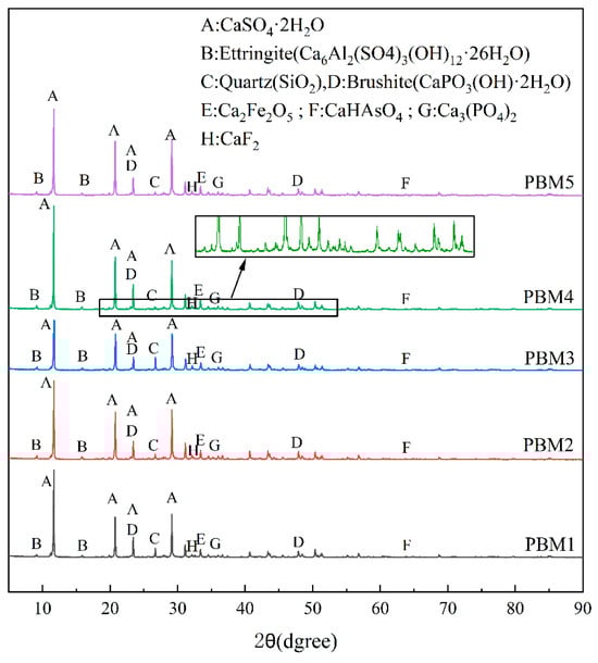 Figure 6 shows the XRD patterns of PBM specimens at different ratios for 28 days. The diffraction peaks of the XRD patterns of PBM with different ratios are basically the same, indicating that the hydration products in the backfill materials are basically the same, but the intensity of the diffraction peaks corresponding to each crystal is still different. As can be seen in Figure 6, the crystalline minerals in the XRD patterns of the PBM specimens are mainly calcium sulfate dihydrate (CaSO4·2H2O, PDF#33-0311), ettringite (Ca6Al2(SO4)3(OH)12·26H2O, PDF#41-1451), quartz (SiO2, PDF#46-1045), brushite (CaPO3(OH)·2H2O, PDF#11-0293), srebrodolskite (Ca2Fe2O5, PDF#71-2264), haidingerite (CaHAsO4, PDF#74-0141), calcium phosphate (Ca3(PO4)2, PDF#29-0359), and calcium fluoride (CaF2, PDF#48-1298). The presence of quartz (SiO2) comes from unreacted solid particles. As can be seen from the comparison of Figure 6 with Figure 3, the presence of Ca2SiO4 was not found in the backfill material, indicating that the Ca2SiO4 in the SS had a base activation reaction and dissolved. It has been shown [30,52,53,54,55] that SS mainly relies on the reaction of Ca2SiO4 to provide the gelling capacity. Srebrodolskite detected in the XRD patterns is mainly derived from SS. Ettringite is a hydration product in the gelling system. The early strength of the filled specimens mainly depends on ettringite, which is mainly produced by the reaction of PG with dihydrate of calcium sulfate in PG and Al2O3 in GGBS involved in the reaction [56]. Haidingerite is a compound produced by the reaction of heavy metal elements with Ca2+.