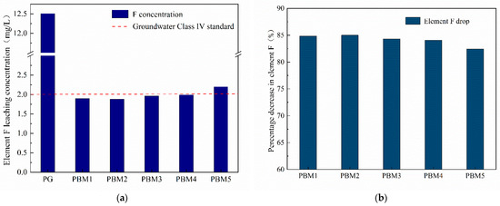Fluorine is mainly derived from phosphates (fluorapatite, Ca5(PO4)3F), and most of the fluorine is volatilized to HF gas during phosphoric acid production. However, due to volatilization or incomplete reaction, some of the fluorine remains in the PG and negatively affects the environment, leading to an excess of fluorine in the groundwater of the surrounding environment. The average fluorine-element leaching concentration of phosphogypsum was about 12.5 mg/L, far exceeding the groundwater Class IV standard (2 mg/L). As can be seen in Figure 8a, the concentration of the element fluorine in the leachate decreases substantially when PG is mixed with binders. When the SS content was too low (PBM5), its fluorine leaching concentration was 2.2 mg/L maximum. The leaching concentration of the element fluorine under other ratios is basically below 2 mg/L, which meets the groundwater class IV standard. As can be seen in Figure 8b, the curing efficiency of fluorine-element at different ratios is more than 80%, indicating that utilizing a mixture of GGBS, SS, and PG helps to cure fluorine contamination. It was shown that fluorine ions react with Ca ions in the backfill slurry to form the insoluble compound CaF2 [21,22]. As shown in Figure 5, CaF2 was detected in the XRD pattern, which was similar to that of Ref [24]. This further indicates that the F ions were stabilized by reacting to form compounds. In the PBM system, due to the addition of NaOH and SS, with SS containing a certain amount of CaO and therefore providing more Ca2+ for the system, NaOH mixing makes the system alkaline, resulting in the increase in Ca2+ and OH−, which helps the curing of F−. The maximum leaching concentration of elemental fluorine in PBM5, which is more than the standard of groundwater class Ⅳ, may be due to the low content of SS and the reduction in the CaO content, which resulted in less Ca2+ content in the slurry. Possible chemical equations for the fluorine curing/stabilization process [68]: