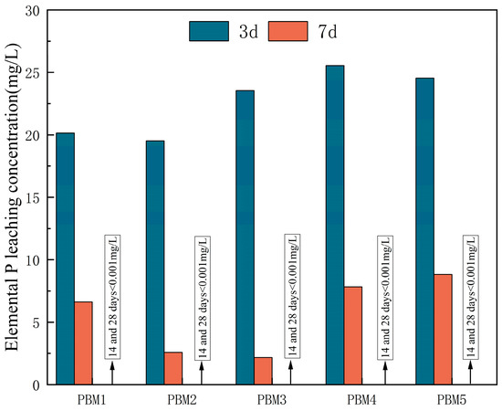 Elemental phosphorus is an important environmental indicator, and Figure 9 shows the leaching concentration of elemental phosphorus for PBM specimens at 3, 7, 14, and 28 days for each ratio. Phosphorus is mainly derived from phosphate, and the leaching concentration of elemental phosphorus in PG exceeds 40 mg/L. From Figure 9, it can be seen that the phosphorus leaching concentration in PBM leachate decreases with the increase in the age of hardening, and the rate of decrease in phosphorus leaching concentration is basically the same in all groups of PBM, all of them have the fastest rate of decrease in 3–7 days, and the rate of decrease slows down in 7–14 days, until the phosphorus in PG is solidified and stabilized. When the age of hardening exceeded 14 days, the phosphorus leaching concentration was detected to be less than 0.001 mg/L, indicating that the PBM system helped to stabilize the phosphorus element.