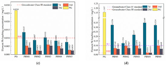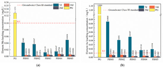 As can be seen from Table 2, the elements in PG with leaching concentrations of heavy metal elements exceeding the groundwater Class III standard are mainly Mn, Pb, As, and Ni. Figure 10 shows the results of heavy metal leaching tests of the specimens at 7, 14, and 28 days, which shows that the heavy metal leaching concentration of the filled specimens with more than 7 days of hardening is significantly reduced and decreases with the increase in the age of hardening. The overall curing effect of the Mn element was the best, and its leaching concentration was much lower than that of the groundwater class III standard (0.1 mg/L) from 7 days, and the maximum Mn leaching concentration was 0.049 mg/L (Figure 10a). Ni has the highest heavy metal content in PG, and it can be seen from Figure 10d that the curing effect of metal elements of Ni at 7 days of maintenance was poor, and the leaching concentration was much higher than that of the groundwater class III standard (0.1 mg/L), and after 14 d of maintenance, Ni leaching concentration significantly decreased, although the leaching concentration was still higher than that of the groundwater class IV standard (0.02 mg/L); after 14 days of maintenance, Ni leaching concentration is obviously reduced, although the leaching concentration is still higher than that of the groundwater III standard, but in line with that of the groundwater IV standard (0.02 mg/L). The leaching concentration of As and some Pb elements of PBM exceeded that of the groundwater class III standard at 7 days of maintenance, and with the increase in maintenance time, the heavy metals were gradually cured, and the leaching concentration decreased, which was lower than that of the class III specification requirements. Through the toxicity leaching test of PBM, the results basically meet the relevant standards, indicating that the whole solid waste is feasible as a curing agent for PG. In previous studies, many of them added cement or quicklime to synergize with other solid wastes as curing agents [20,23,24]. In contrast, the use of all-solid waste in this study reduces the use of cement and quicklime.