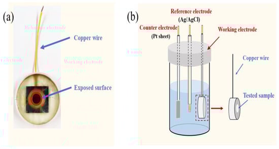 A three-electrode cell (see Figure 1b) was used to perform the EIS tests, which contained the reference electrode of an Ag/AgCl (3.5 M KCl, R0303), the counter electrode of a platinum foil (15 mm × 15 mm × 0.2 mm) and the working electrode of the sample. The exposed area in 3.5 wt.% NaCl solution of the sample was about 1.0 cm2. The distance between the sample and the Ag/AgCl was 10 mm, the same as the Ag/AgCl and the platinum foil. All the EIS tests were placed in a metallic cage for avoiding external electromagnetic interference.