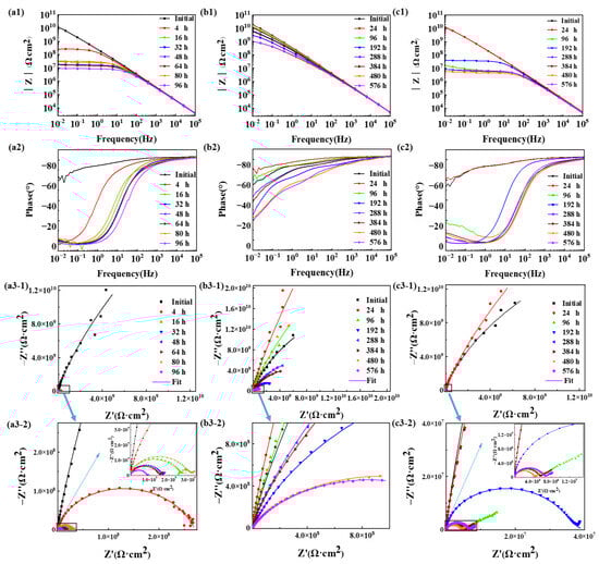 In Figure 2, the impedance spectra presented as Bode plots, phase angle plots and Nyquist plots of the epoxy coating samples during the 96 h/576 h (24 cycles) in the three accelerated tests were presented. At the initial time, the impedance values of the samples in Bode plots at 0.01 Hz were more than 1.2 × 1010 Ω·cm2 in Figure 2(a1,b1,c1), significantly above the threshold impedance of 1.0 × 107 Ω·cm2. The phase angle approached near −90° over the majority of the measuring frequency range in Figure 2(a2,b2,c2). The Nyquist plot displayed in Figure 2(a3-1,a3-2,b3-1,b3-2,c3-1,c3-2) exhibited only a single time constant (one large semicircle). Hence, the epoxy coating samples exhibited excellent corrosion resistance at first.