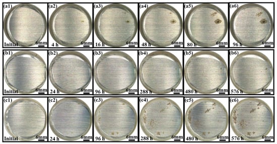 The surface morphologies of the epoxy coating samples with different cycles in the three accelerated tests are depicted in Figure 3(a1–c6). At the initial time, the surfaces of the coatings were transparent and intact with no corrosion pits (see Figure 3(a1,b1,c1)). However, it was quickly observed that there were one or two small corrosion spots that appeared on the carbon steel substrate surface in the EPolarization+Immersion after 4 h (one cycle) and the ESalt+Polarization+Immersion+UV after 24 h (one cycle). As time went on, the corrosion spots gradually expanded to be a clearly corroded area. At the same time, some new corrosion spots arose on the other carbon steel substrate region. The corroded area in the ESalt+Polarization+Immersion+UV after 288 h (12 cycles) was obviously larger than that in the EPolarization+Immersion after 48 h (12 cycles) (see Figure 3(a4,c4)). It meant that the corrosion in the ESalt+Polarization+Immersion+UV was more serious than that in the EPolarization+Immersion. The corroded area was further enlarged and the extent of corrosion was more serious in the EPolarization+Immersion after 96 h (24 cycles) and in the ESalt+Polarization+Immersion+UV after 576 h (24 cycles). In particular, only a small corrosion pit came out in the ESalt+Immersion+UV until 576 h (24 cycles).