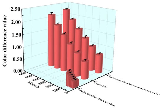 The destruction condition of the epoxy coating film could be measured with a color change, which was obtained by calculating the color difference ΔE of the sample between different cycles and the beginning. In Figure 4, the values of the color difference ΔE under the three accelerated tests were exhibited within 96 h/576 h (24 cycles). All the color difference ΔE values increased with the progress of the cycles. The biggest ΔE value was 2.33 below 5.0, which signified that the whole epoxy coating film of the samples were less broken within 96 h/576 h (24 cycles). However, according to the trend of the color difference ΔE, the final average values were 0.54, 2.16 and 2.27. It was revealed that the damage condition of the epoxy coating samples in the ESalt+Polarization+Immersion+UV and the ESalt+Immersion+UV was more severe than that in the EPolarization+Immersion, and that in the ESalt+Polarization+Immersion+UV was slightly more acute than that in the ESalt+Immersion+UV for the duration.