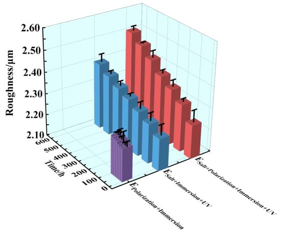 In Figure 5, the surface roughness of the three accelerated tests is depicted, illustrating the extent of destruction observed on the epoxy coating surface layer. The surface roughness average values of all the epoxy coating samples were 2.25 at the initial time, which increased gradually with the extension of time. After 96 h/576 h (24 cycles), the surface roughness average values of the samples in the three tests reached 2.27, 2.41 and 2.51. Among them, the surface roughness in the EPolarization+Immersion was similar, which indicated that almost no damage occurred in the epoxy coating samples. In addition, the changing range of the surface roughness in the ESalt+Polarization+Immersion+UV and the ESalt+Immersion+UV was larger, which meant that a certain amount of damage had occurred in the two tests. And the broken condition in the ESalt+Polarization+Immersion+UV was a bit nastier than that in the ESalt+Immersion+UV, constantly.