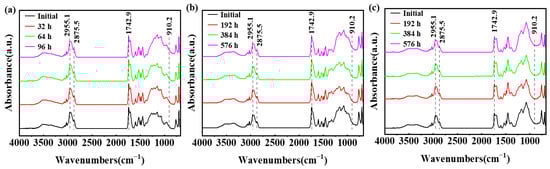 The FT-IR micro-spectroscopy technique can provide an in situ test function and improve the detection sensitivity. Hence, investigating the structural modifications of epoxy coatings under ultraviolet irradiation is a commonly employed approach to examine the degradation of such coatings. As shown in Figure 6, the peak positions of the functional groups from the epoxy coating sample were analyzed during three accelerated tests. The characteristic peaks corresponding to C-H stretching vibration and -CH2 symmetric stretching vibration were observed at 2955.1 cm−1 and 2875.5 cm−1, respectively. The stretching vibration peak associated with the C=O bond appeared at 1742.9 cm−1, while the characteristic peak of the epoxy group was identified at 910.2 cm−1. Throughout the entire process, both the intensity and position of these major peaks of the functional groups remained relatively stable, indicating minimal alteration in their absorption characteristics.
