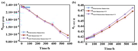 In the Equation (1) reaction, the epoxy groups were consumed, whose band area proportion could be used to revealed the post-curing degree of the epoxy coatings. In the Equation (2) reaction, the C=O groups were newly formed, while the C-H was reduced. Therefore, the destruction level of the epoxy coatings during the aging process could be quantified by the ratio of band areas between C=O and C-H. In Figure 7a, there has been a gradual decrease in the proportion of epoxy group band area to the total peak area. Notably, ESalt+Polarization+Immersion+UV exhibited the most significant reduction, slightly surpassing ESalt+Immersion+UV and significantly exceeding EPolarization+Immersion. These findings indicate that there is a post-curing phenomenon occurring in epoxy coatings under ultraviolet irradiation. In Figure 7b, the ratio of C=O to C-H increases with an increasing number of cycles, further confirming decomposition within the polymer coated with epoxy. The rise in C=O to C-H ratio is much more pronounced in ESalt+Polarization+Immersion+UV and ESalt+Immersion+UV compared to EPolarization+Immersion, suggesting that UV radiation could expedite the deterioration process of epoxy-coated polymers.