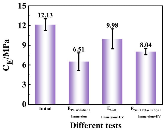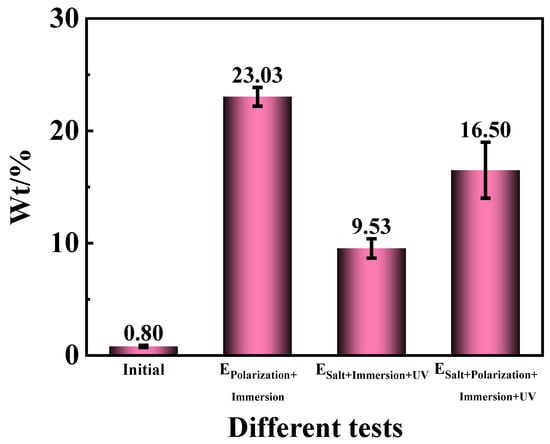 - Combination of the EPolarization+Immersion test and the ESalt+Immersion+UV test, called ESalt+Polarization+Immersion+UV. This new test contained three parts. (a) The step was the same as in the (a) of the (2) in the ESalt+Immersion+UV test, so the time was 8 h. (b) Then, the step was the same as in the (1) of the EPolarization+Immersion test, so the time was 4 h. (c) Then, the step was the same as in the (c) of the (2) in the ESalt+Immersion+UV test, so the time was 12 h. The entire time of one cycle in this test was also 24 h.