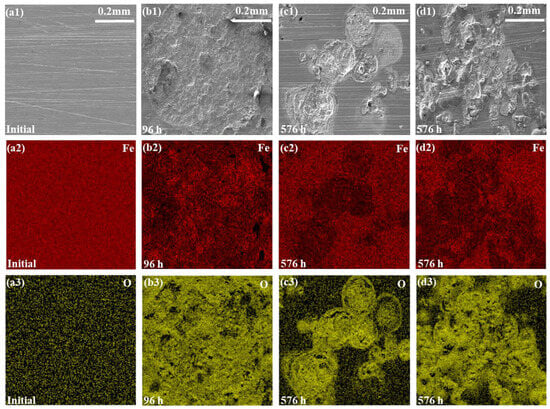 SEM images and EDS results for the epoxy coating samples at the initial (a1–a3) and after 96 h/576 h (24 cycles) in the EPolarization+Immersion (b1–b3), the ESalt+Immersion+UV (c1–c3) and the ESalt+Polarization+Immersion+UV (d1–d3).