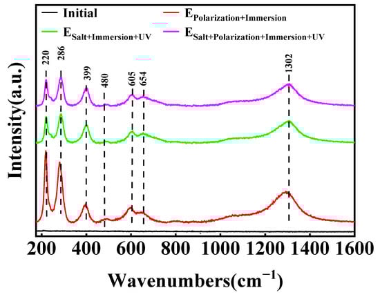 The Raman spectra of the corrosion products (see Figure 10) reveal that in the destructed site after the adhesion test, the peak values at 220, 286, 399, 480, 605 and 1302 cm−1 can be put down to α-Fe2O3, while the peak value at 654 cm−1 should be imputed to Fe3O4 [,]. These characteristic peaks further indicate the formation of iron oxides during the metamorphic process of the samples.